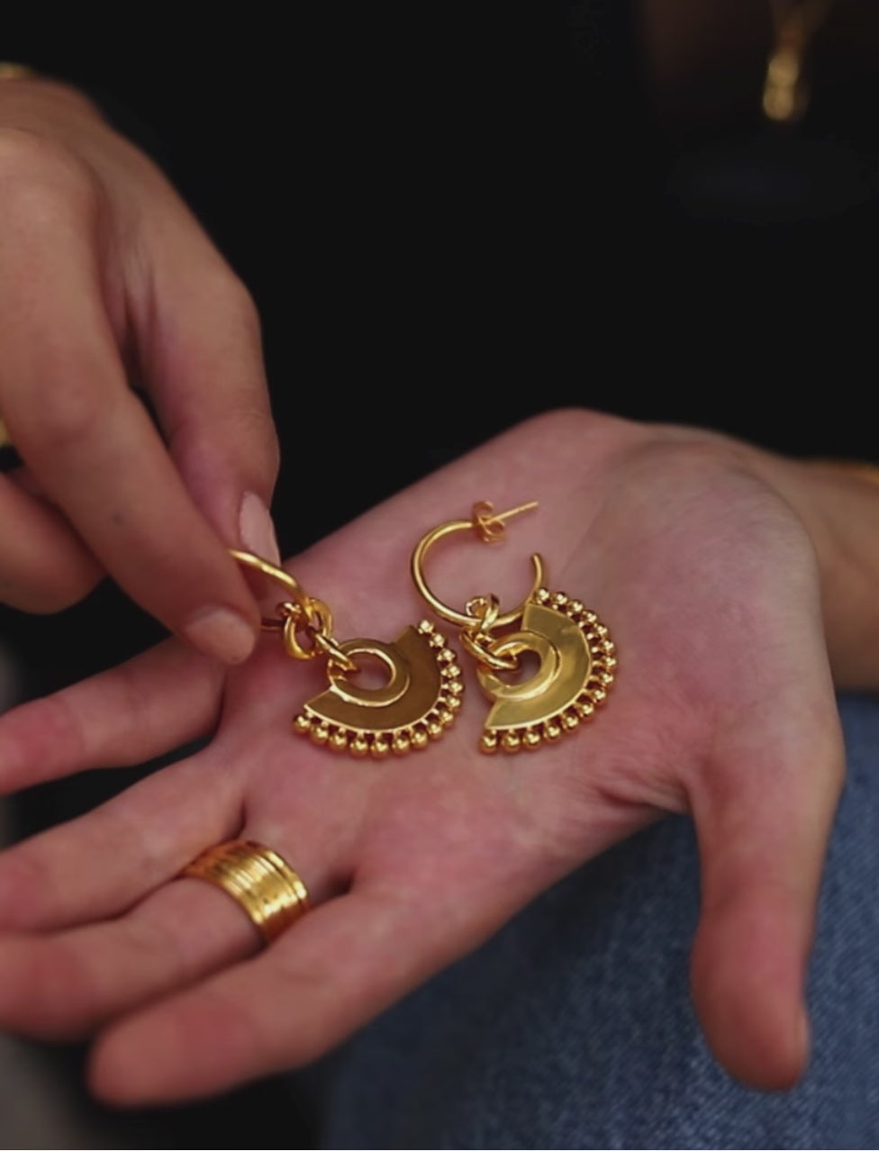 Everyday statement hoops inspired by Colombia. These unique best selling earrings feature bobble-trimmed charms suspended from delicate hoops in 18k Gold plating. Add to your ear stack with chunky gold huggies or pair with the Zenyu Fan Necklace. As seen in The White Lotus.
